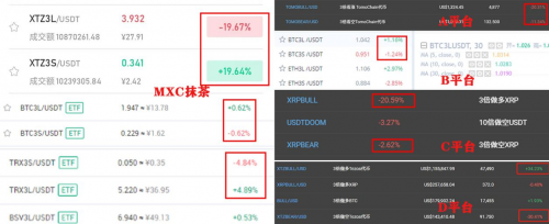 而A、C平台的TOMO以及XRP杠杆ETF交易对呈现出了做多做空都会亏钱的状态,这样的平衡机制显得不合理。B、D平台相对较好,但多空交易对也有0.1数量级的比例差,相较于MXC抹茶来说差距在3倍左右。